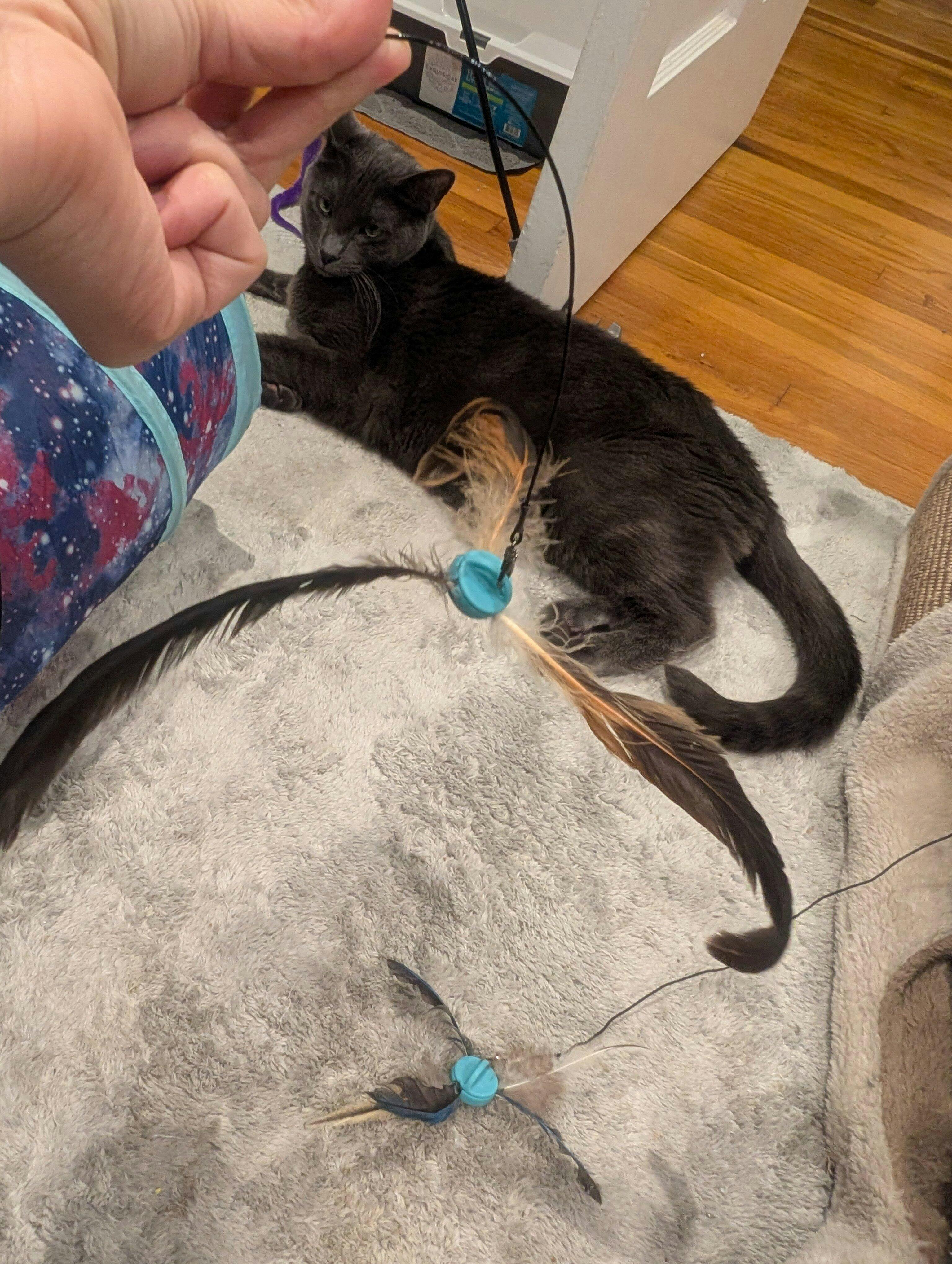 I am overdue for a trip to my local craft store to see what else I can use to modify and enhance toys for my foster cats, but I will certainly be updating this review with successful ways this toy can be used once I get more supplies! That being said, this toy really is perfect as is, it is the perfected and refillable version of purr-peller cat wand attachments. If you have a cat that fancies toys that can mimic the flight of birds or just any feather toy in general they will love the forever prey!